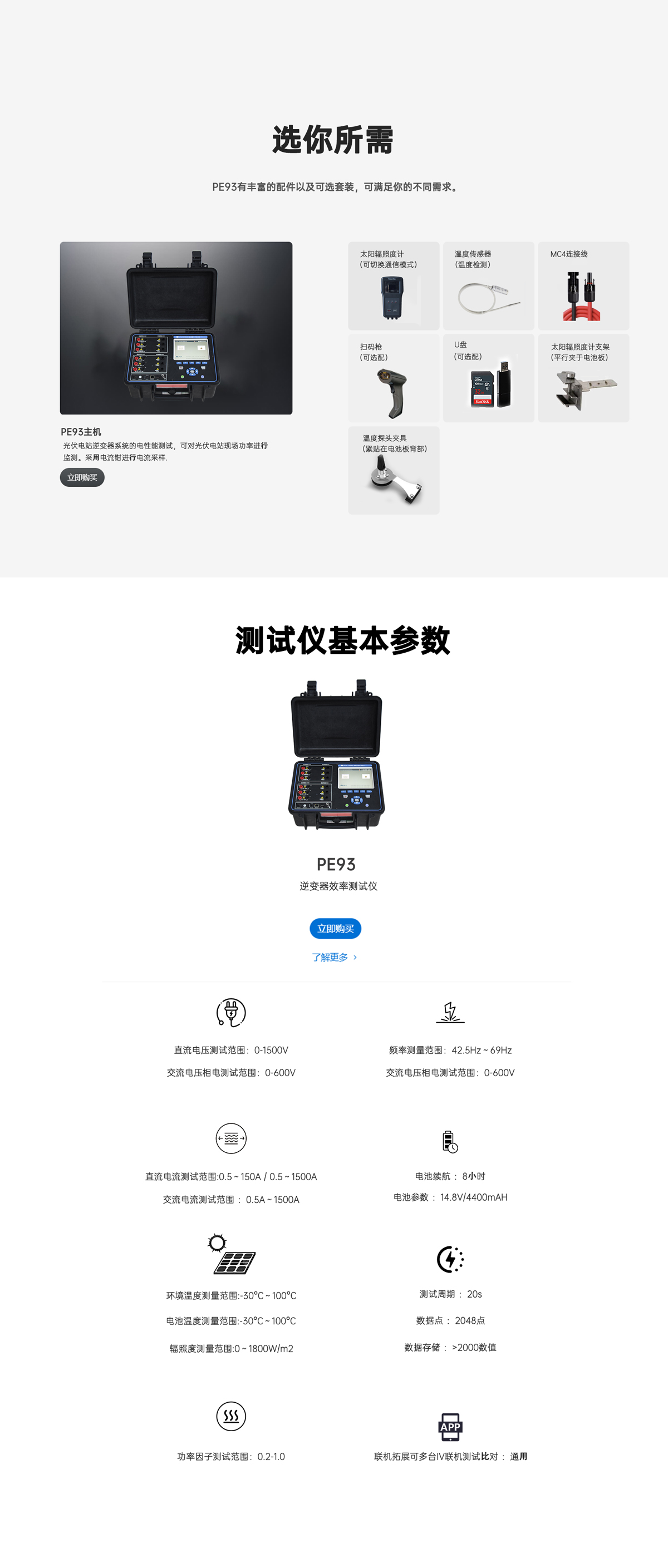 LX-PE93逆變器效率測試儀采用電流鉗進行電流采樣,能夠在電站正常工作狀態下對電站中不同節點的功率進行實時記錄分析。整機配備輻照系統,可在電站各節點測量出準確的實時發電效率并在系統自動生成PR值。